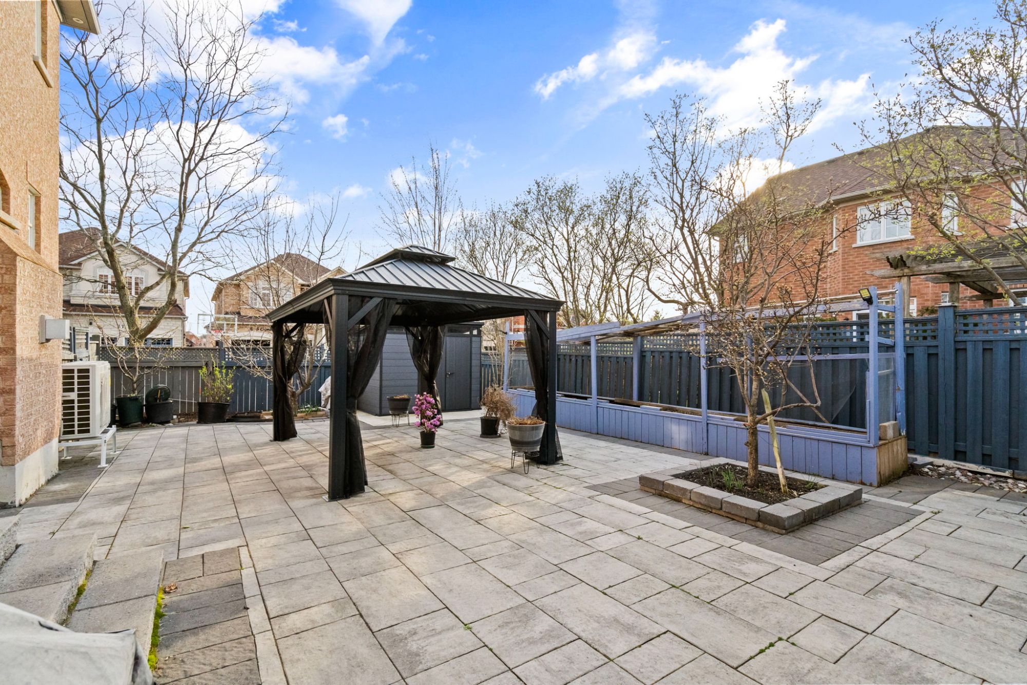 Outside, the private backyard is a true family oasis. Enjoy a cozy gazebo, a garden shed, exterior spotlights, a gas line for your BBQ, fully interlocked grounds, a vegetable garden, and mature apple and cherry trees. Two gates on the corner lot add everyday convenience and enhanced privacy.