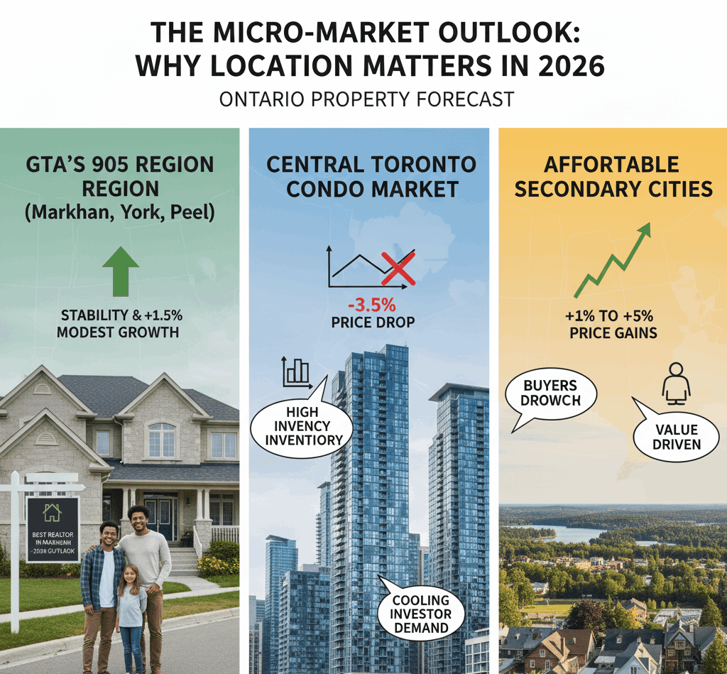 GTA’s 905 Region (Markham, York Region, Peel): This market, characterized by large, detached, family-friendly homes, is expected to be the most resilient segment. Demand here is driven by stable local demographics, families needing space for growth, and is less sensitive to investor-focused policies. The price corrections in these areas are largely in the past, and 2026 is forecast to see stability or modest, low-single-digit price growth (+0.5% to +1.5%) as buyer confidence returns.