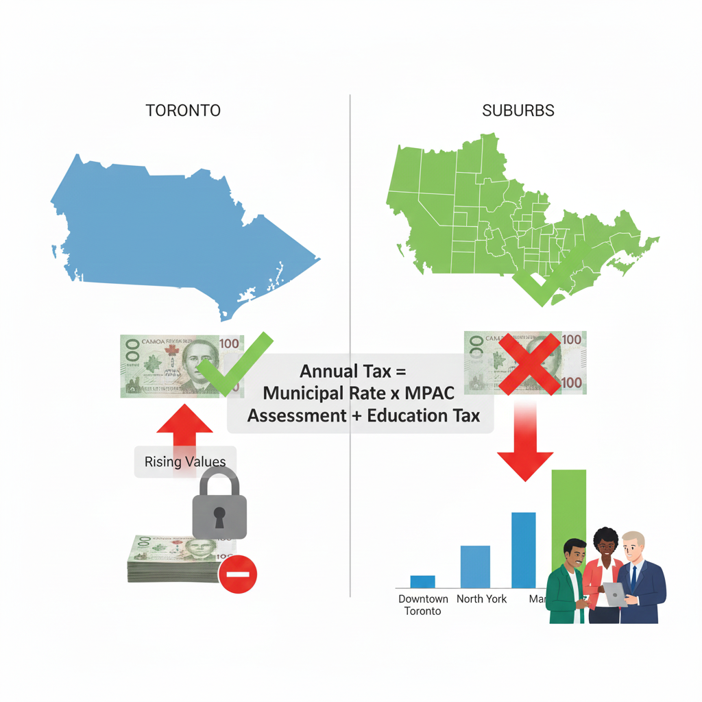 Toronto’s property taxes remain lower than many surrounding suburbs, though rising property values continue to shift tax bills.