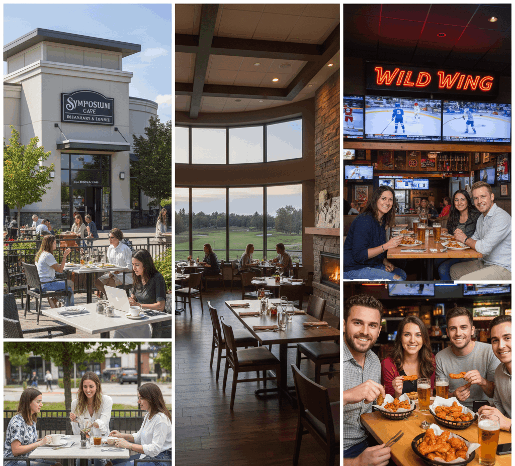 Symposium Café (Shoppes of Angus Glen, Kennedy & Major Mackenzie) This stylish café-restaurant serves all-day brunch, gourmet comfort food, desserts, and specialty coffees. Its lively patio makes it a perfect spot for socializing and lifestyle content, ideal for both families and professionals.