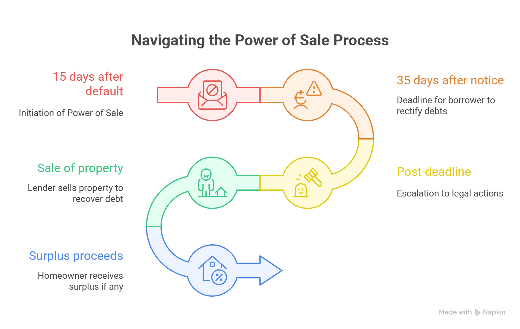 A Power of Sale may be initiated when a borrower defaults on their mortgage payments for more than 15 days. The process typically unfolds as follows: