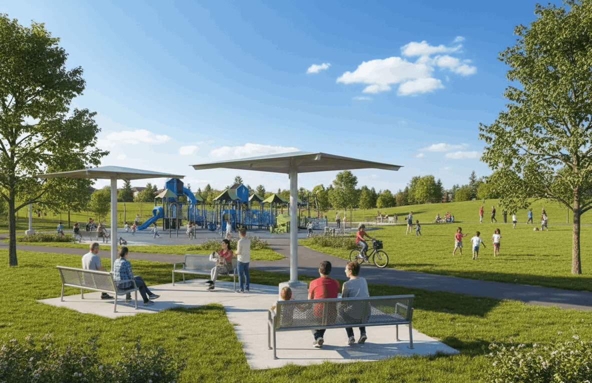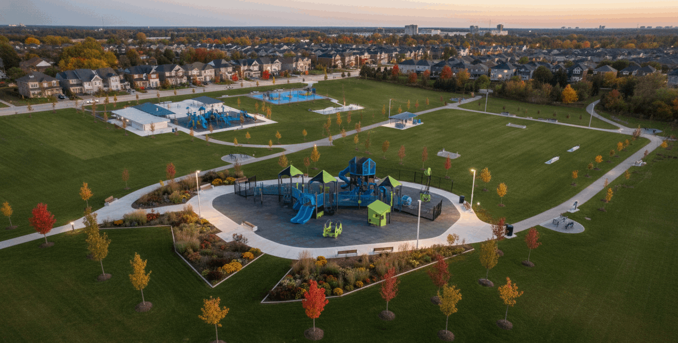 The City of Markham has invested in thoughtful landscaping that adds beauty, shade, and sustainability to the park. Expect: