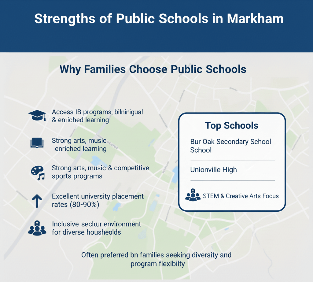 Public schools under the York Region District School Board (YRDSB) remain highly competitive and are often preferred by families seeking diversity and program flexibility.