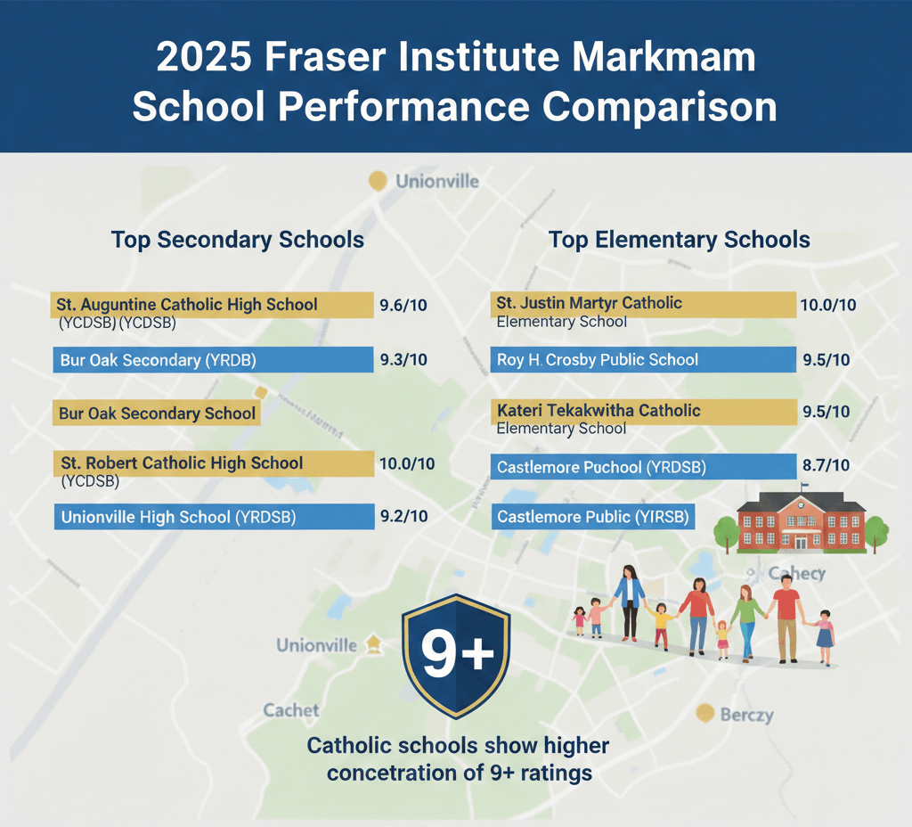 Overall, Catholic schools claim a higher concentration of 9+ ratings, which is a key reason families aggressively target Catholic school zones in Unionville, Cachet, and Berczy.