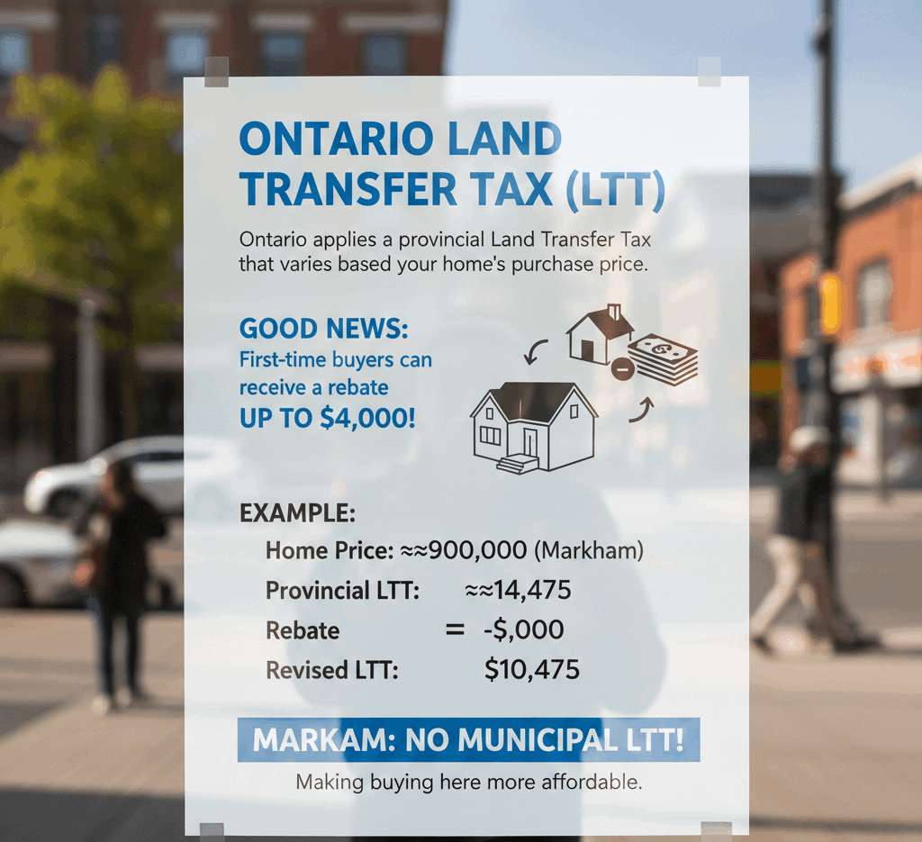 If you buy a home around $900,000 (common in Markham), the provincial LTT would be roughly $14,475, but the rebate can reduce this to $10,475.