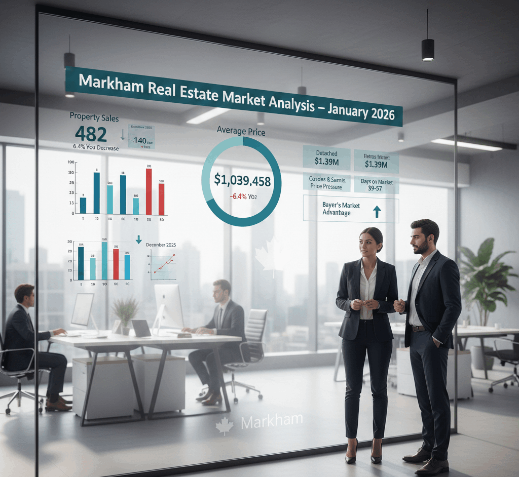 January 2026 recorded 482 property sales in Markham at an average price of $1,039,458, down 6.4% from the previous year. In comparison, December saw 140 sales with a median price of $1.076M.