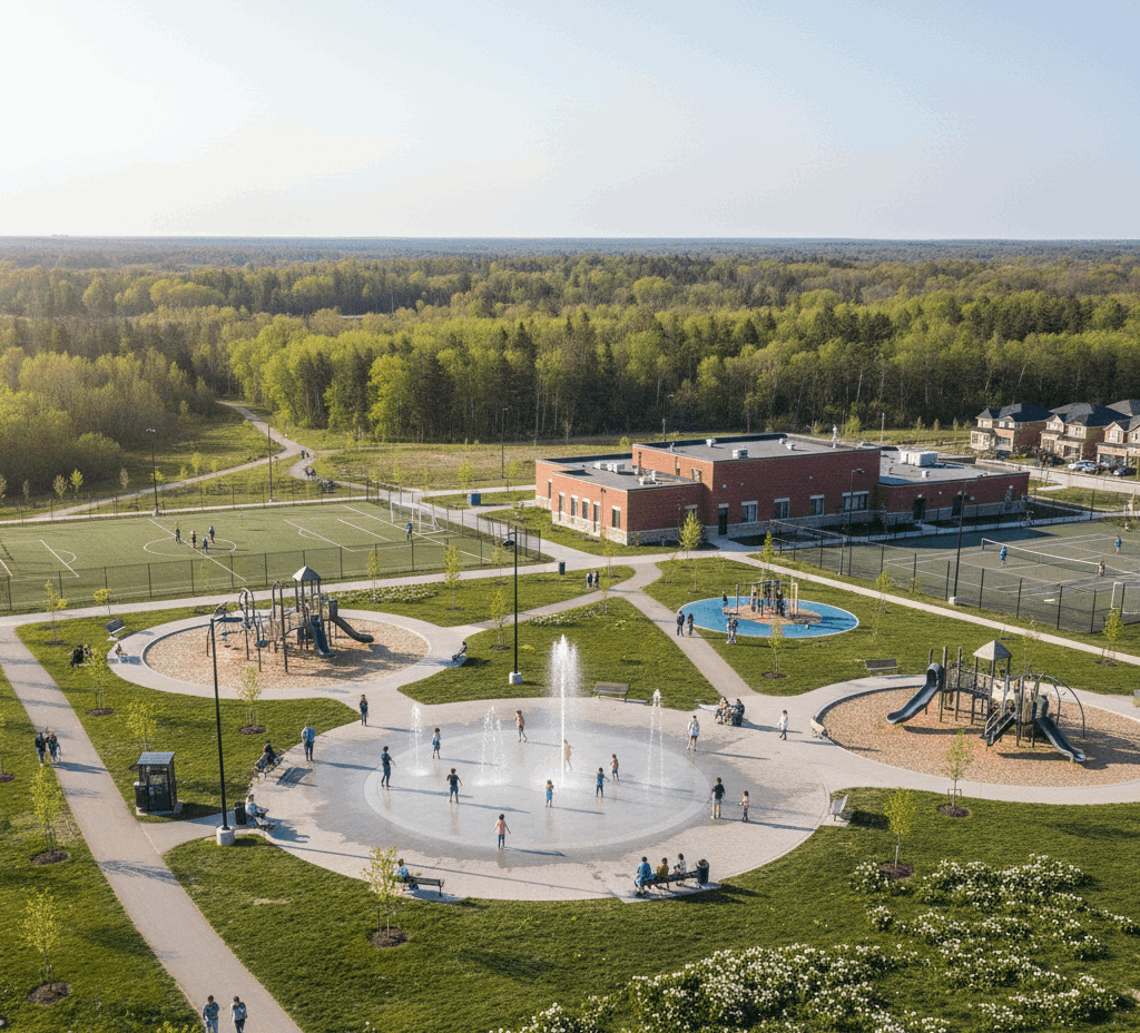 Wismer Commons is anchored by Wismer Park, a community favorite featuring two playgrounds (for toddlers and older children), soccer fields, tennis courts, splash pads, and wooded trails that bloom with trilliums in the spring. Community events and shared green spaces strengthen neighborhood ties, an important factor for families choosing where to buy.